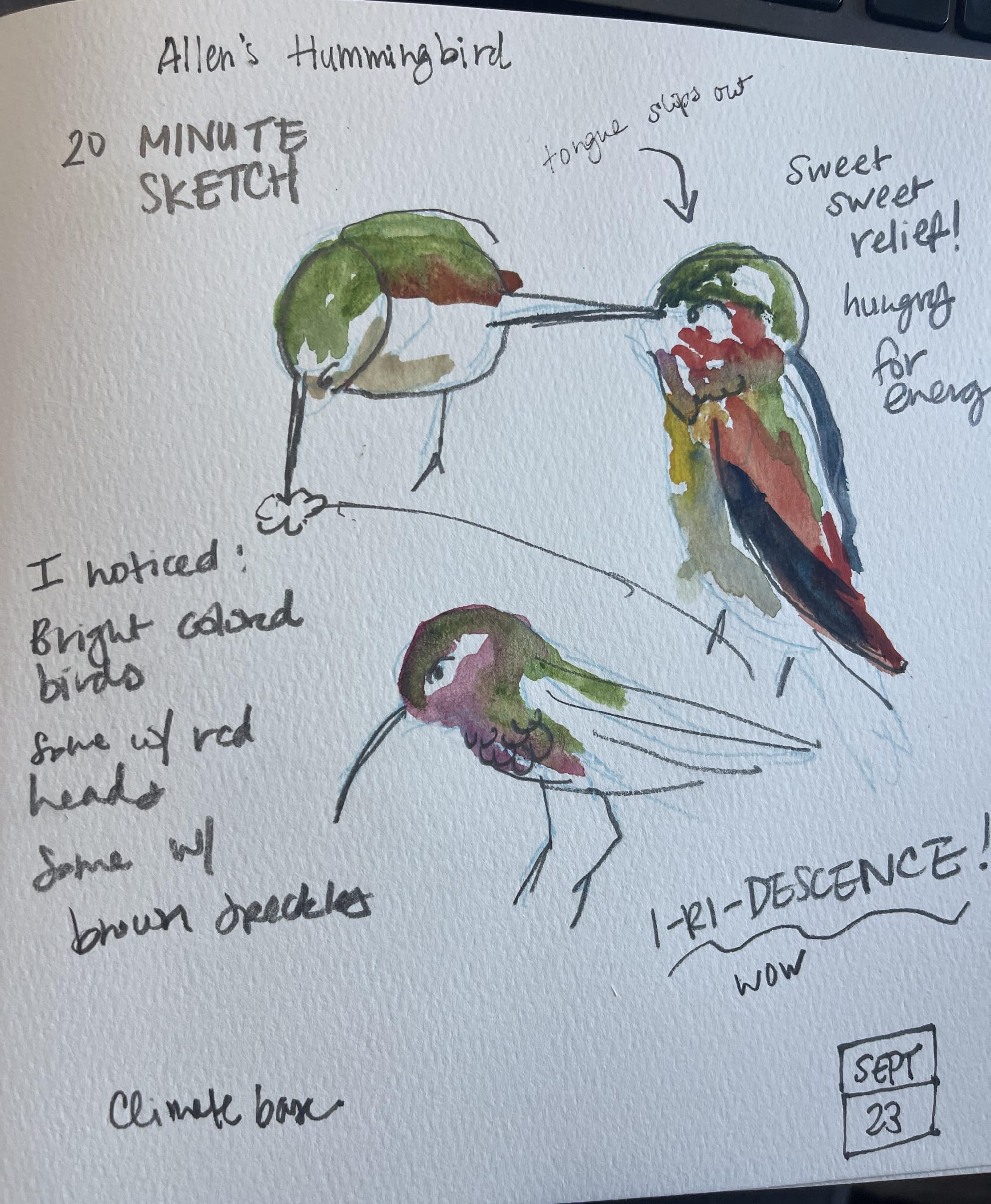 Here's an example of an Allen's Hummingbird at a bird feeder, drawn from live cam (which is no longer available, but you can try this one here featuring a hummingbird nest. Bonus: it has calming music.)