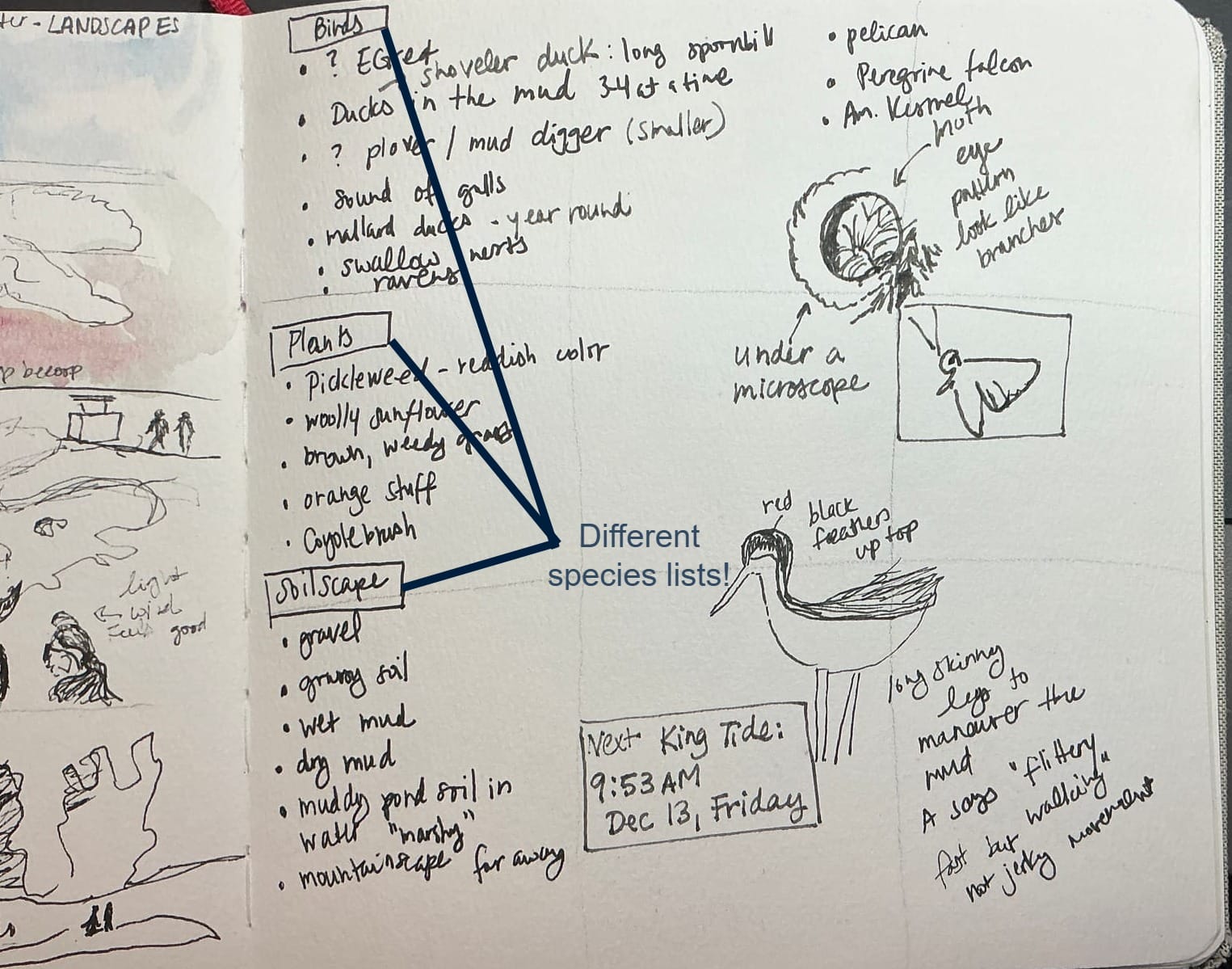 These bulleted lists, sometimes called "species lists" are helpful for noting different critters, plants or even types of soil. Another way to think about them is as lists of curiosities that you want to learn more about. As you continue to practice nature-based journaling, you may find yourself revisiting the species list again for new drawing or journaling inspiration. Maybe, one of those critters will become the focus of your curiosity later.