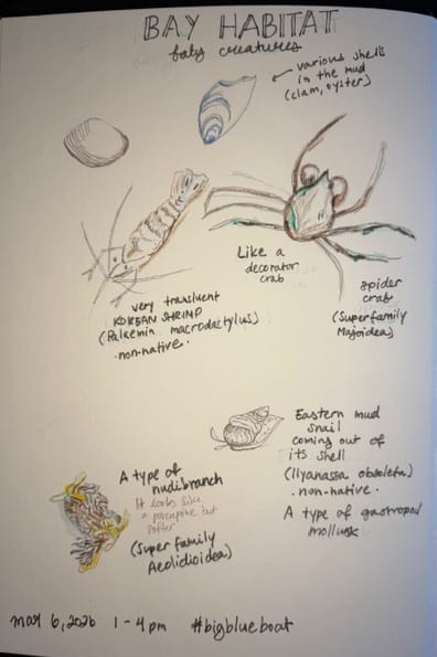 While aboard the Big Blue Boat with docents of the Marine Science Institute in Redwood City, Calif, our docents showed us how to trawl the bay waters to collect biology samples. The collection of species in the sketch below are critters that we discovered that day. This included: a Korean Shrimp, some type of decorator crab, a nudibranch (pronounced nu-dee-brank), basically a type of sea slug, and an Eastern mud snail.